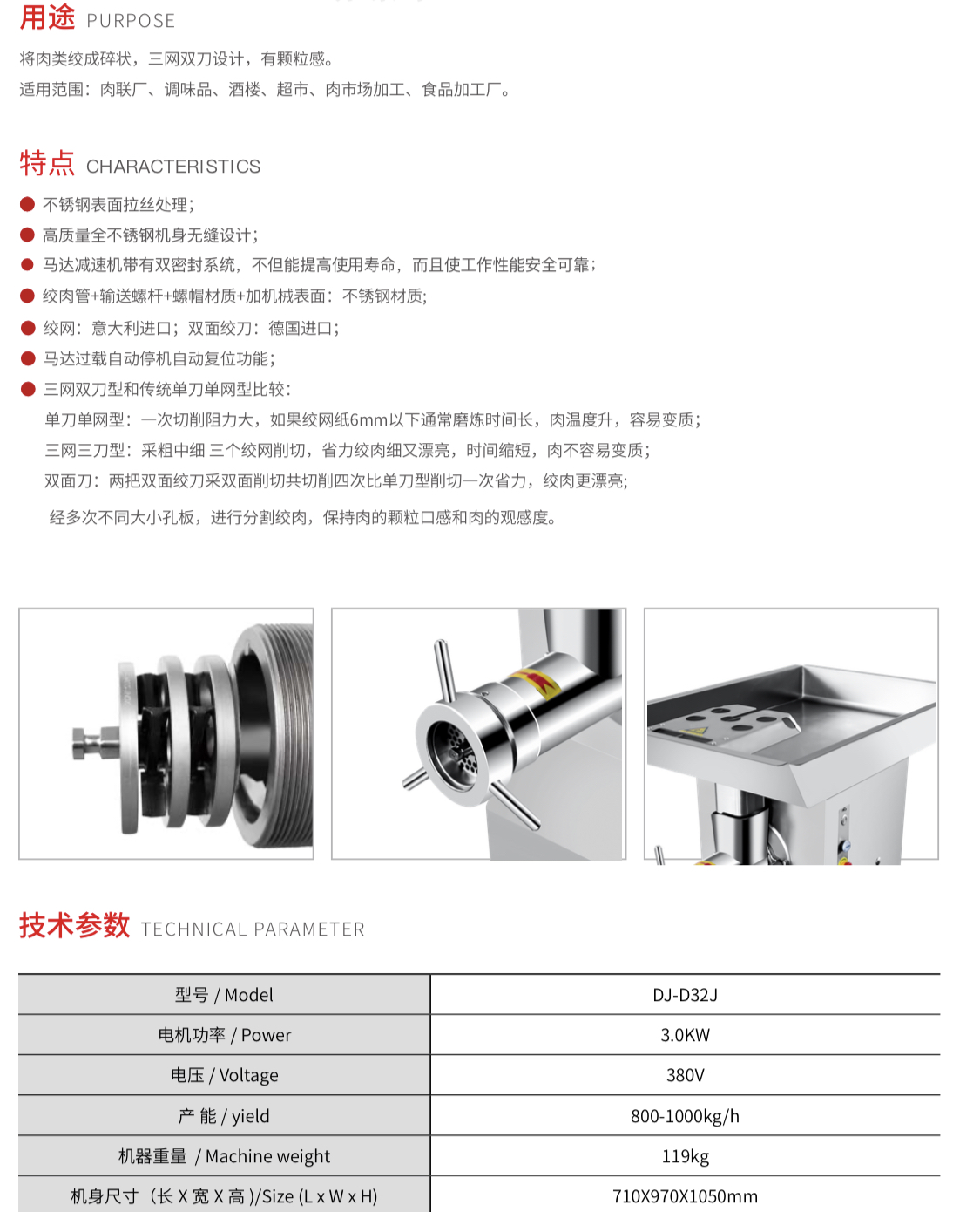 主要用于:猪肉 牛羊肉 鸡鸭鹅肉 鱼肉的绞碎 绞成肉馅等。